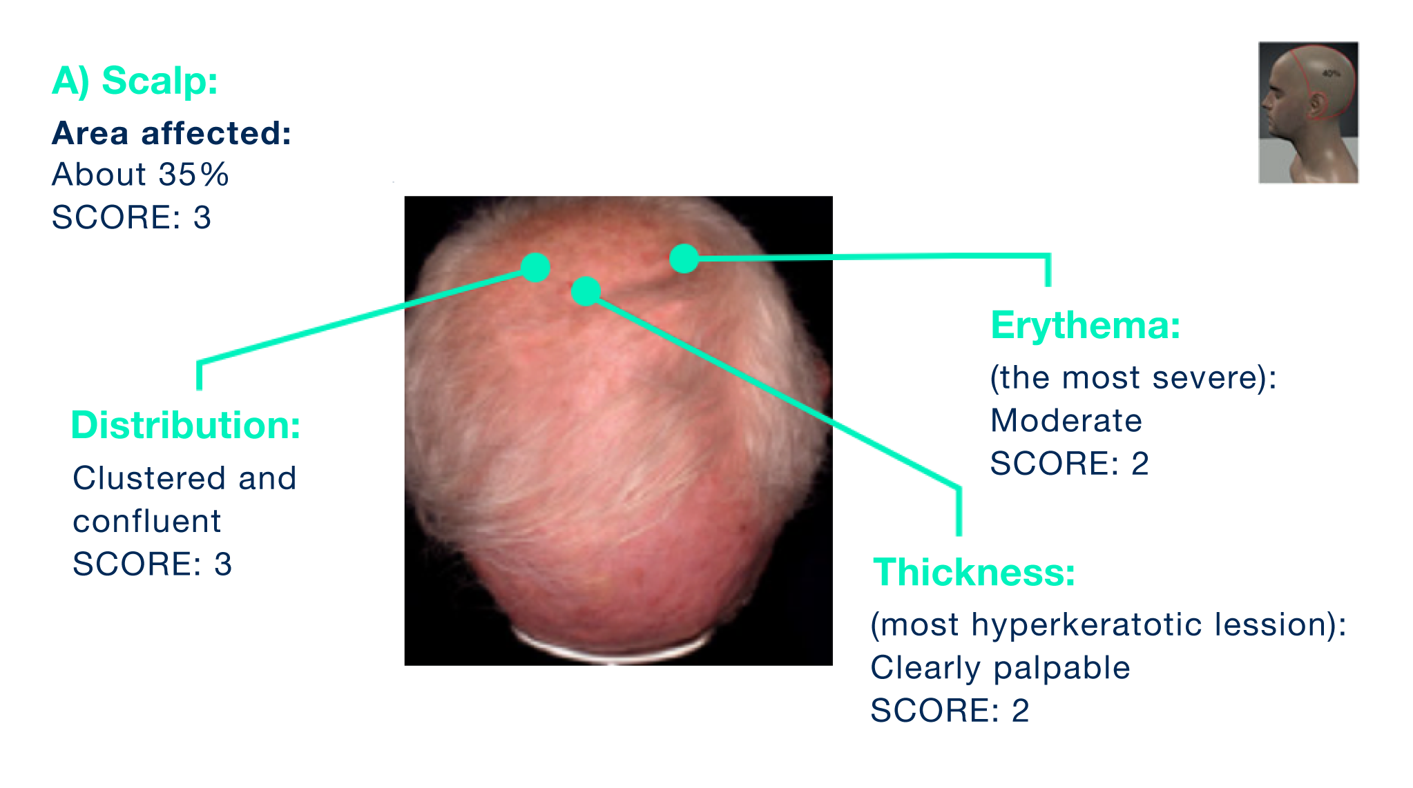 - Sandpaper-like texture should be included in the estimation of area affected. Also include areas covered by hairs into your estimation (e.g. if the scalp is fully covered by hairs there is often no actinic keratotic damage – area score for scalp in this case is 0).