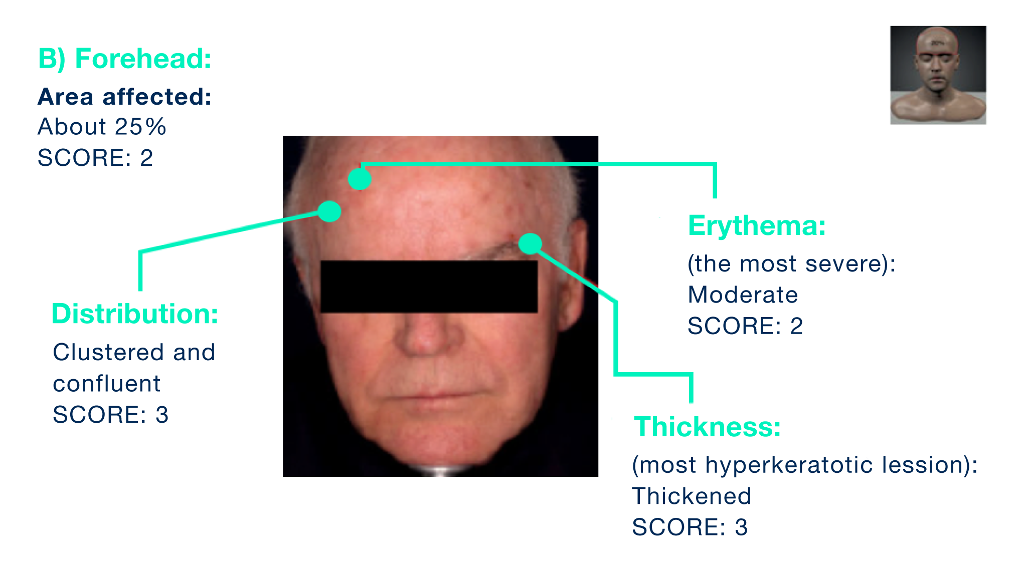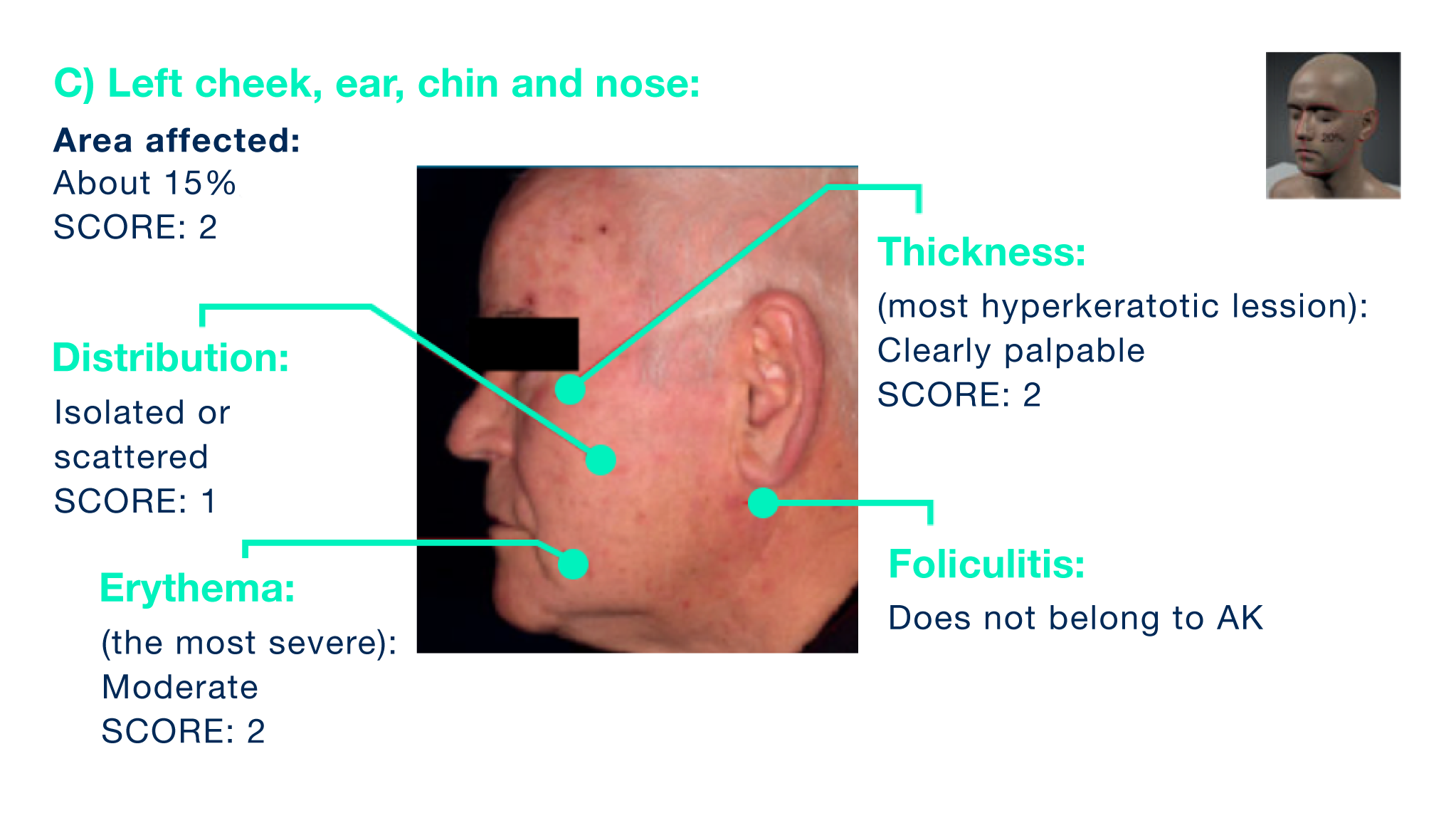 In each region, the percentage of the area affected by AK, the distribution of AKs, the intensity of erythema and the degree of thickness of the worst visible AK are estimated and scored accordingly.